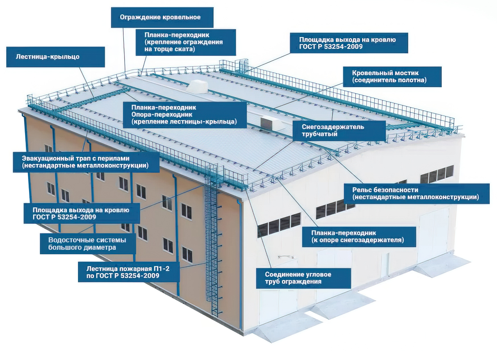 Вся продукция соответствует требованиям Ростехнадзора и МЧС предъявляемых к системам кровельной безопасности промышленных и городских объектов